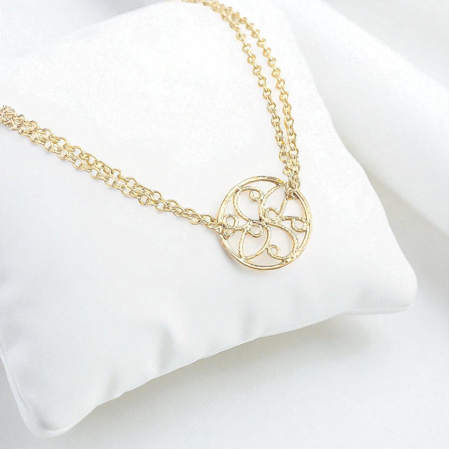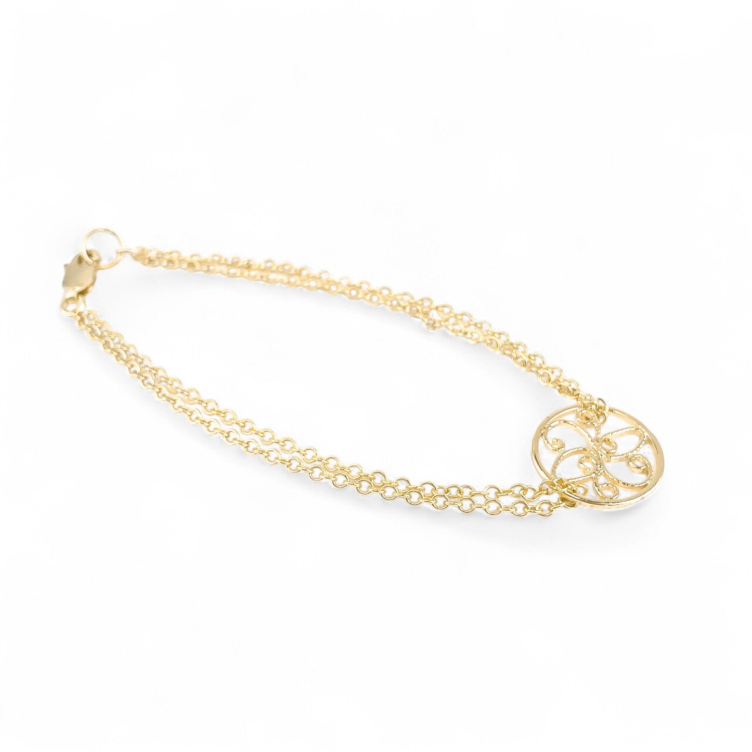 This is a stunning and stylish double-stranded bracelet with a pretty round filigree in the center. The two layers of chain are sturdy and bright!