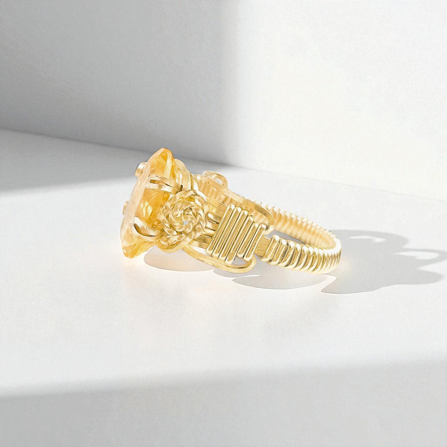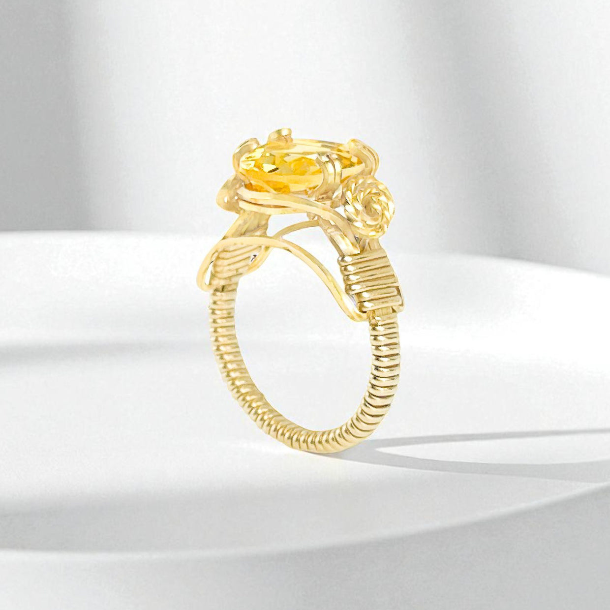 This ring centers around a gorgeous oval citrine stone. The gemstone is incredibly lovely, with various hues of yellow and orange. Absolutely stunning on the finger!