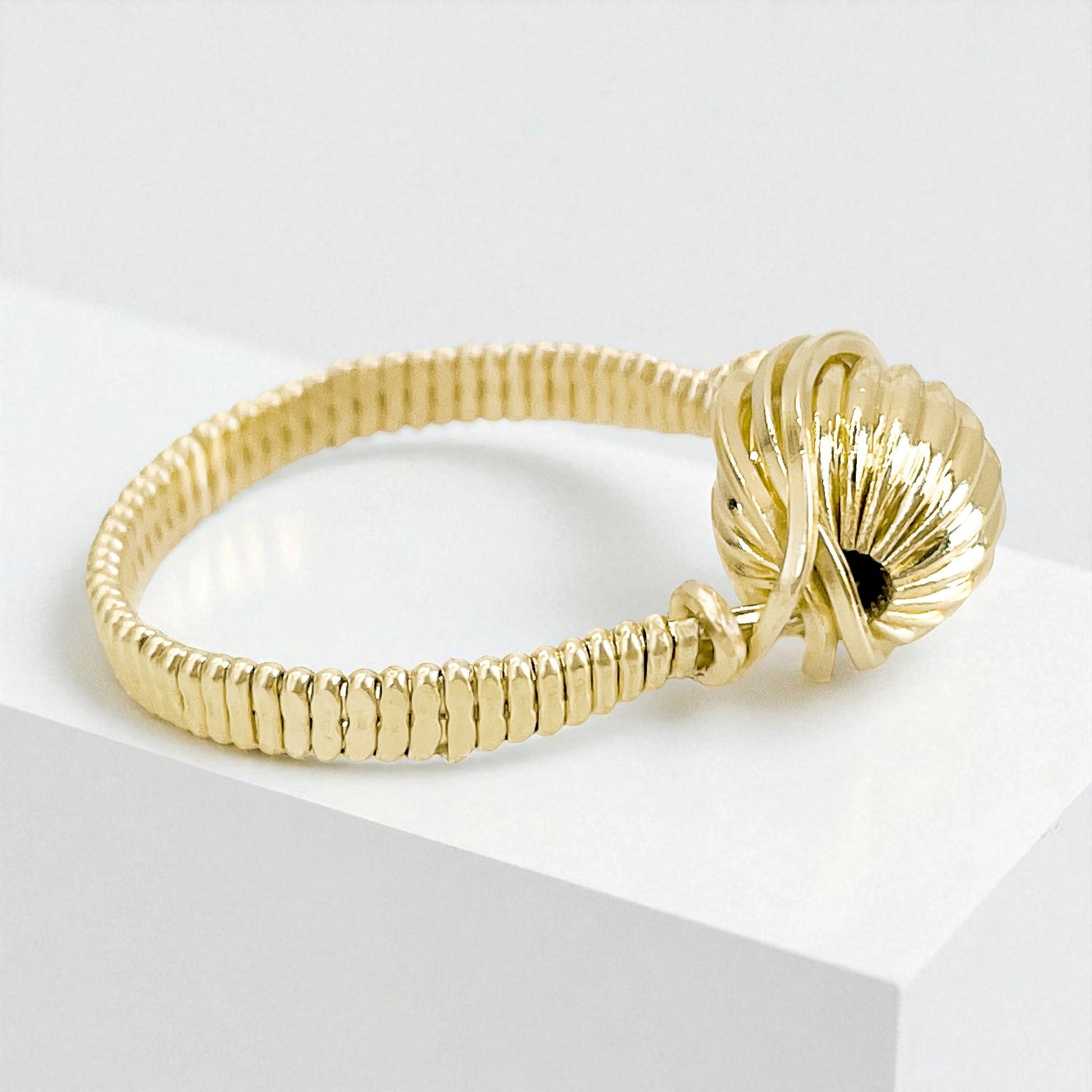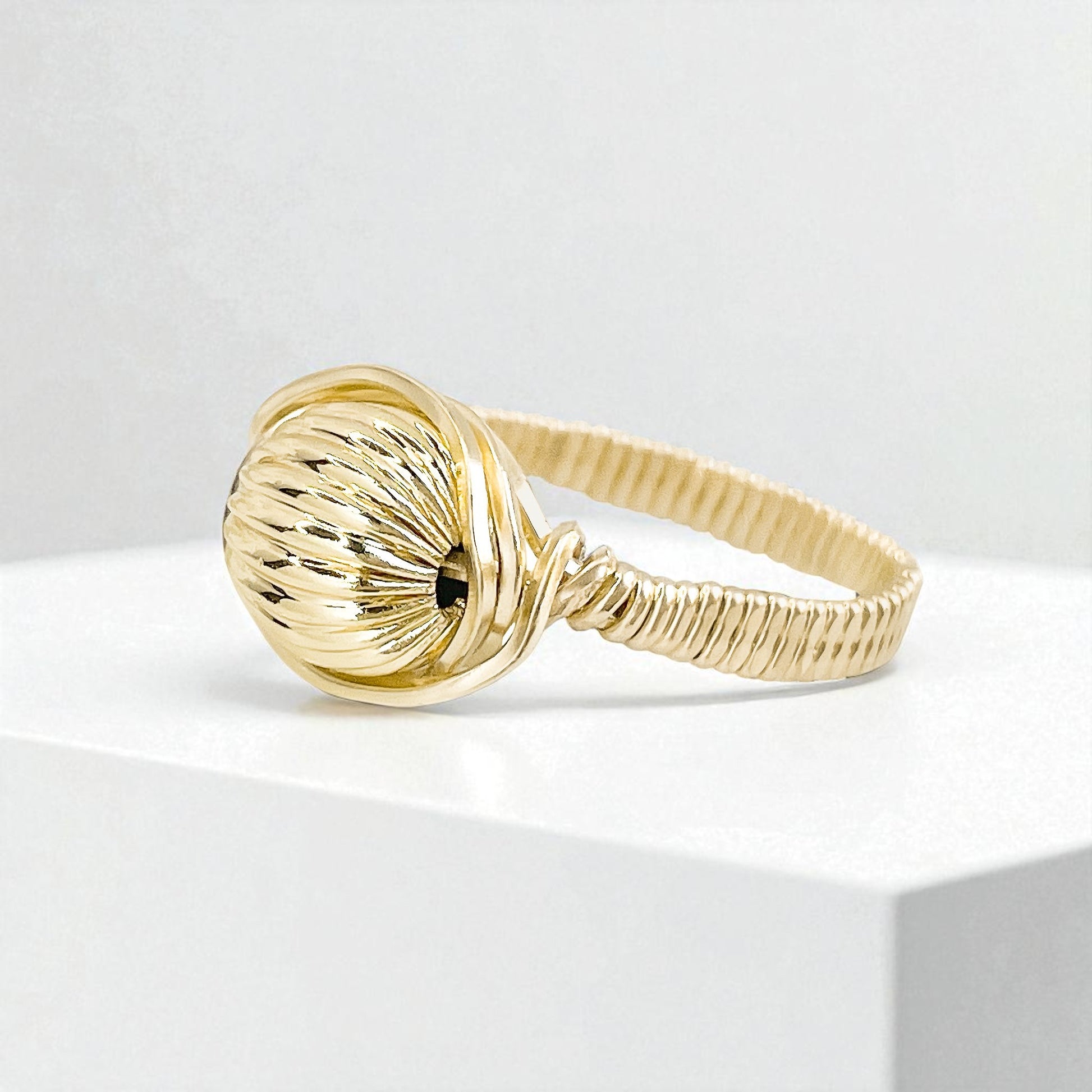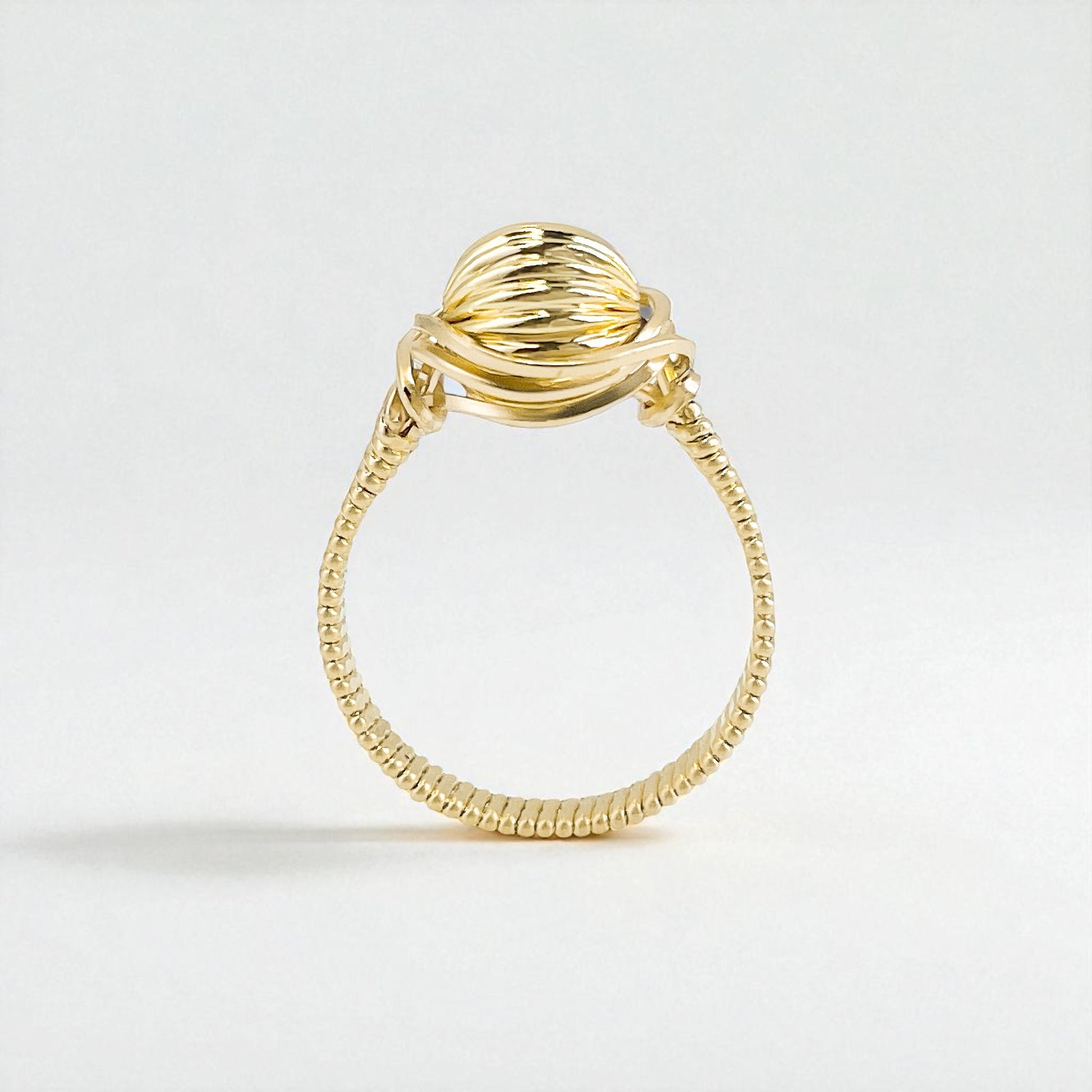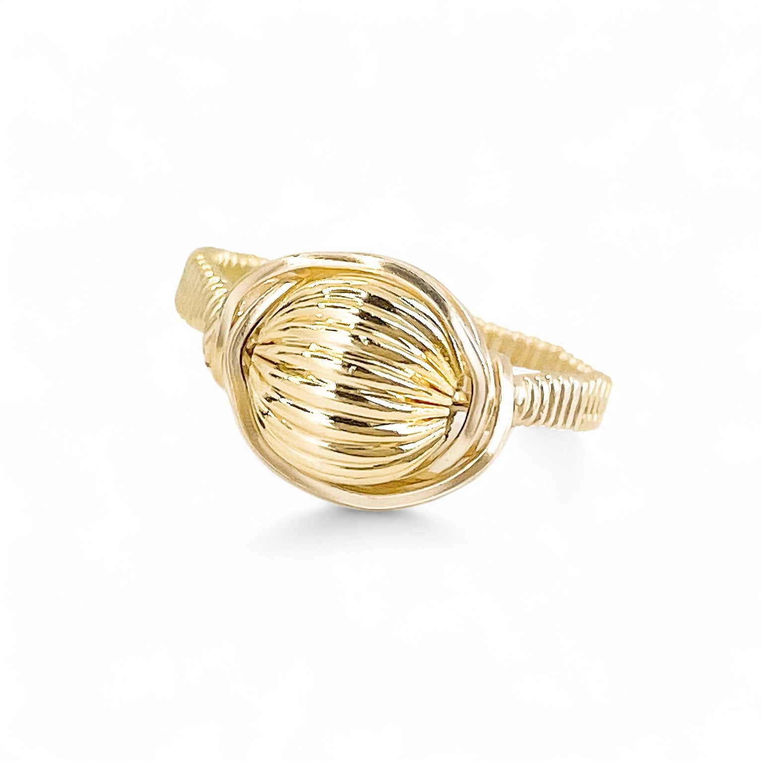 This is a minimalistic and simple beaded ring, yet incredibly elegant with the gold bead wrapped in a halo of gold wire. Modern and chic!