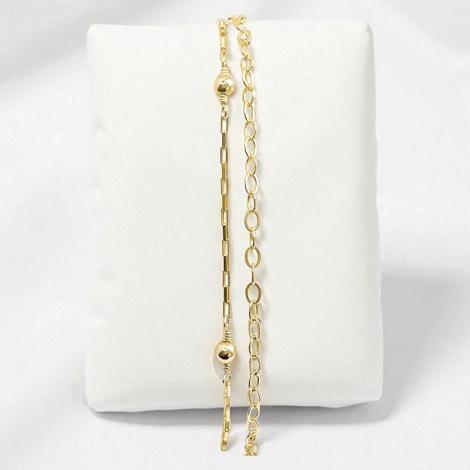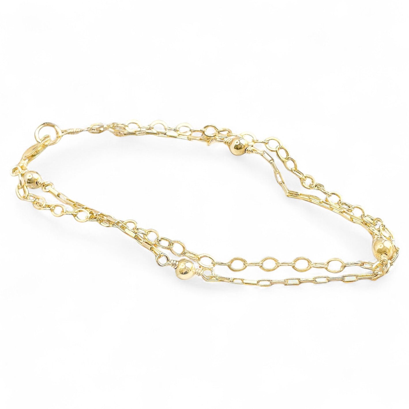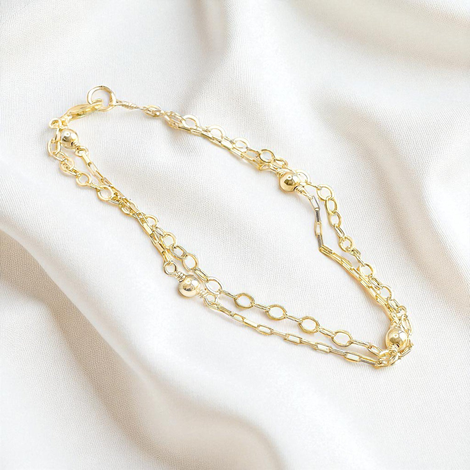 This is a simple and stylish multi-chain bracelet - two in one! One strand consists of gold beads wire-wrapped to a dainty paperclip chain. The other chain is plain with slightly larger links.