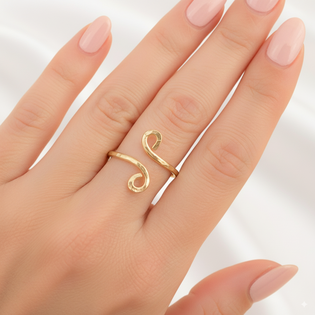 This is a simple gold band with two mini swirls. The ring was formed and hammered from one piece of gold wire. Fun and trendy!