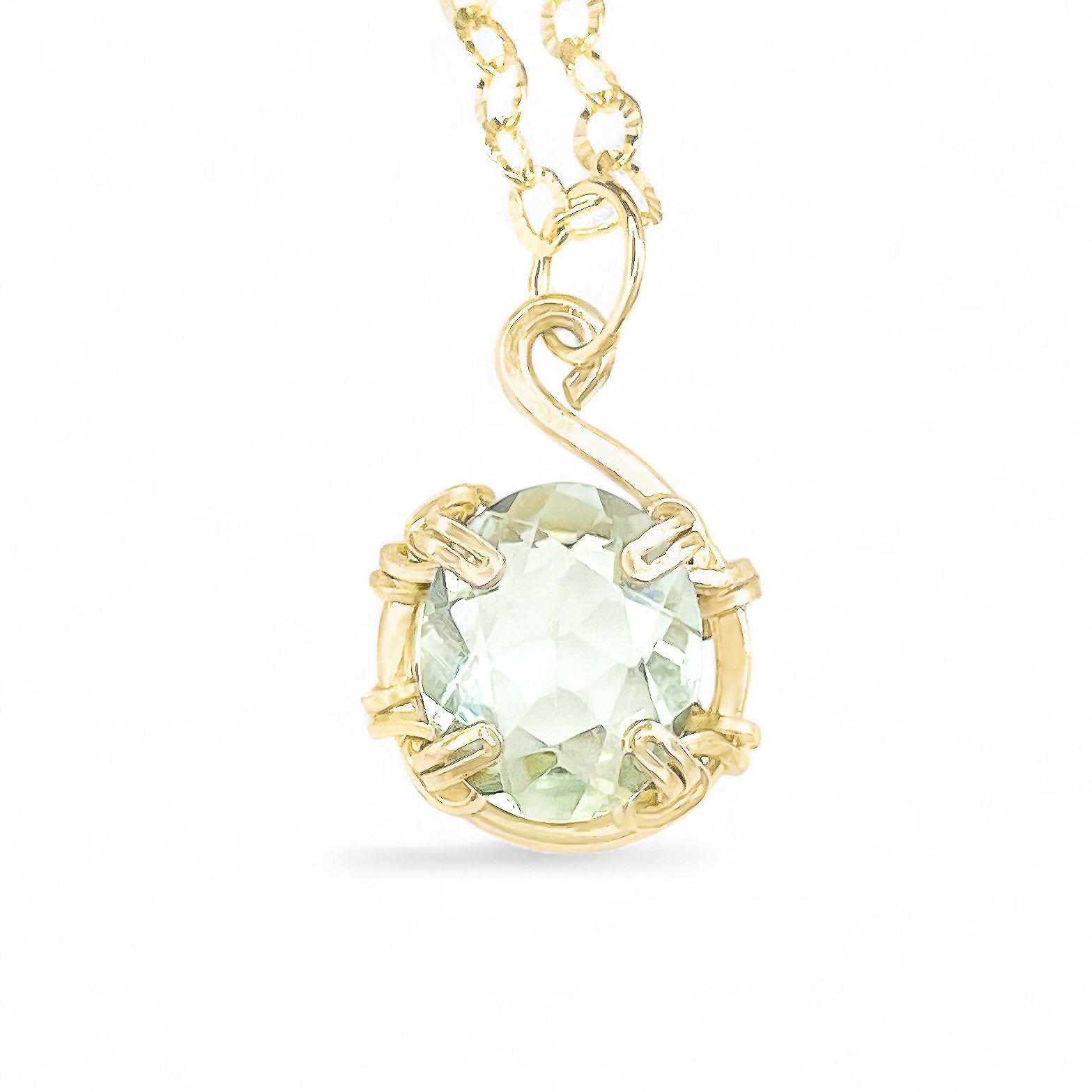 Featuring a gorgeous 12x10mm green amethyst, our wire-wrapped necklace is an elegant and timeless design.