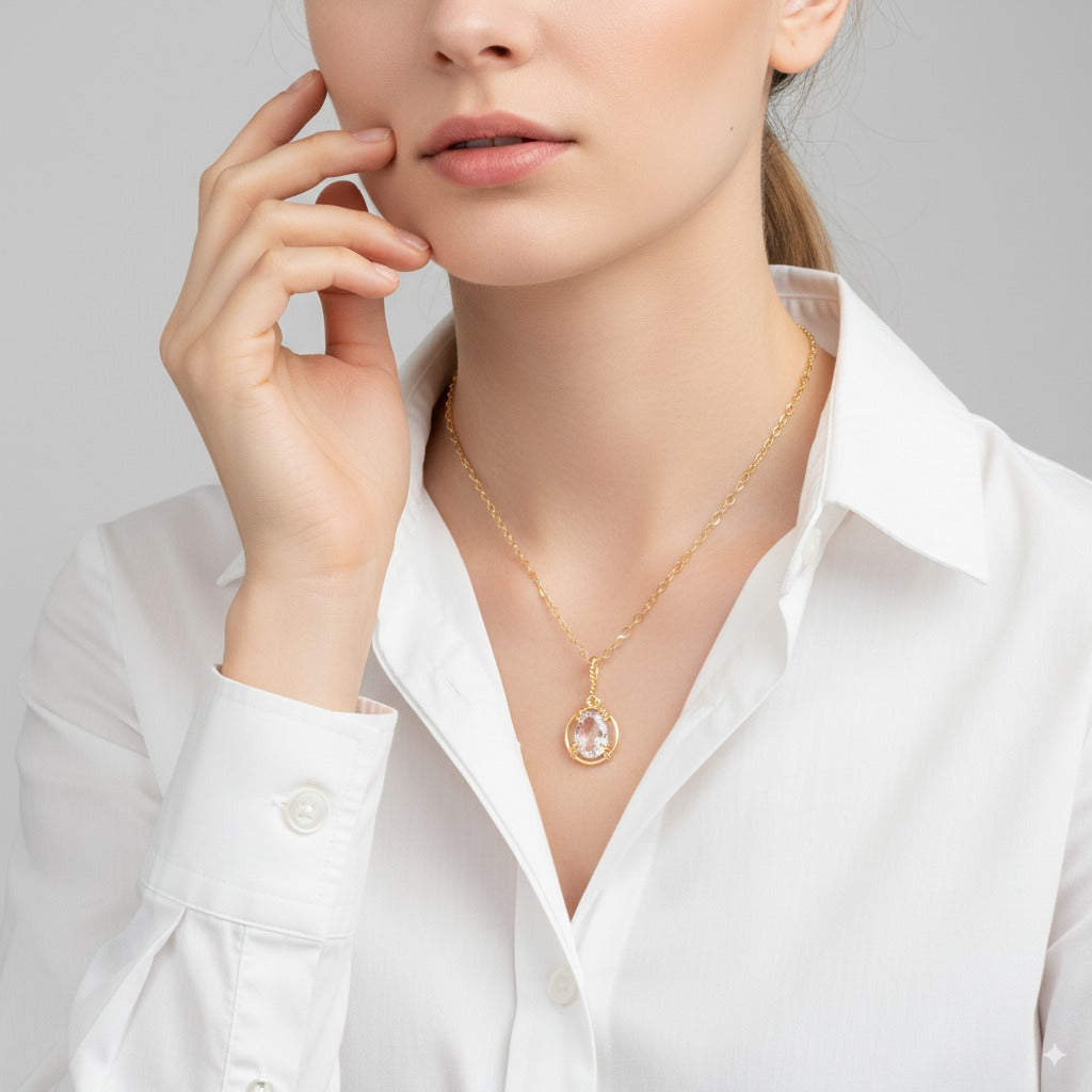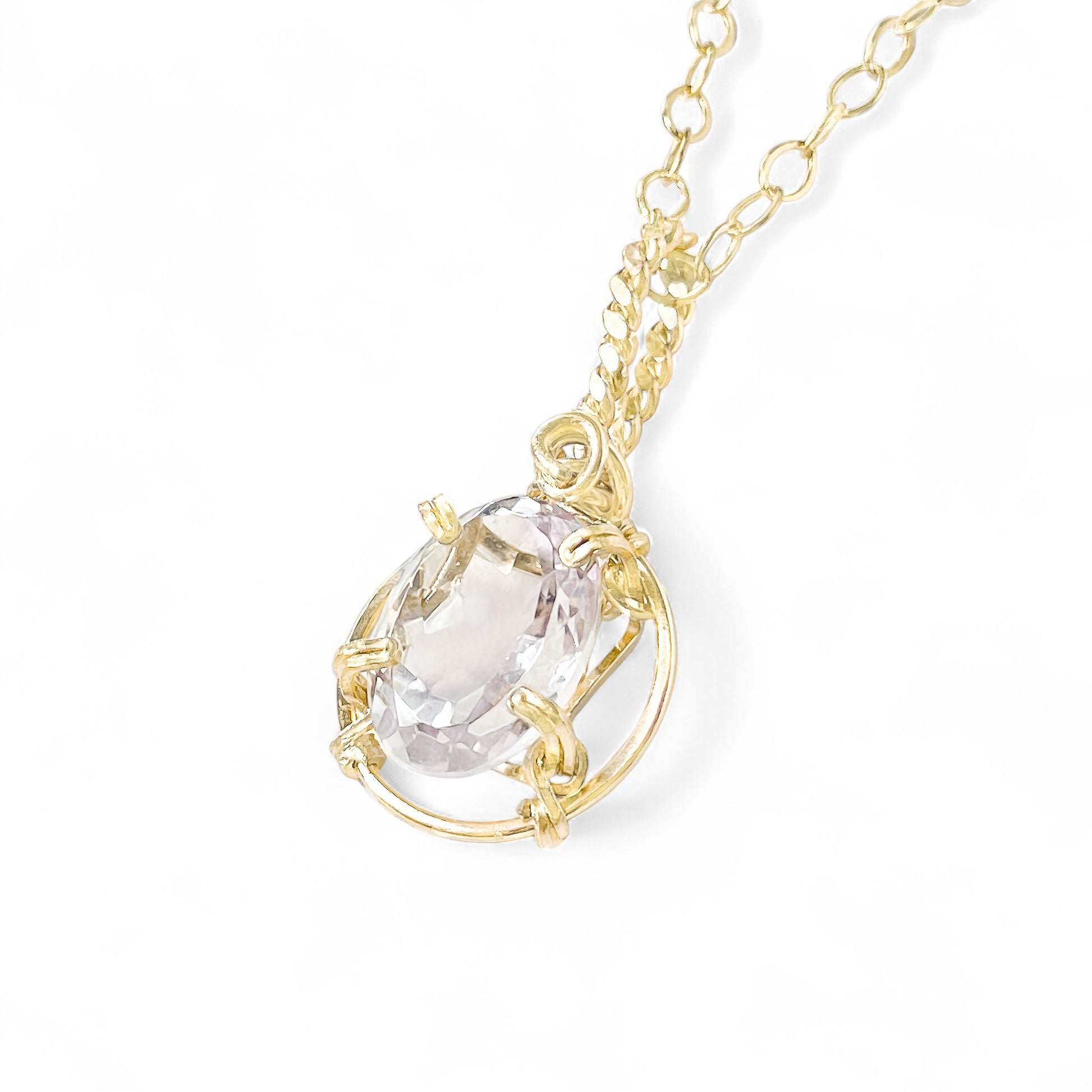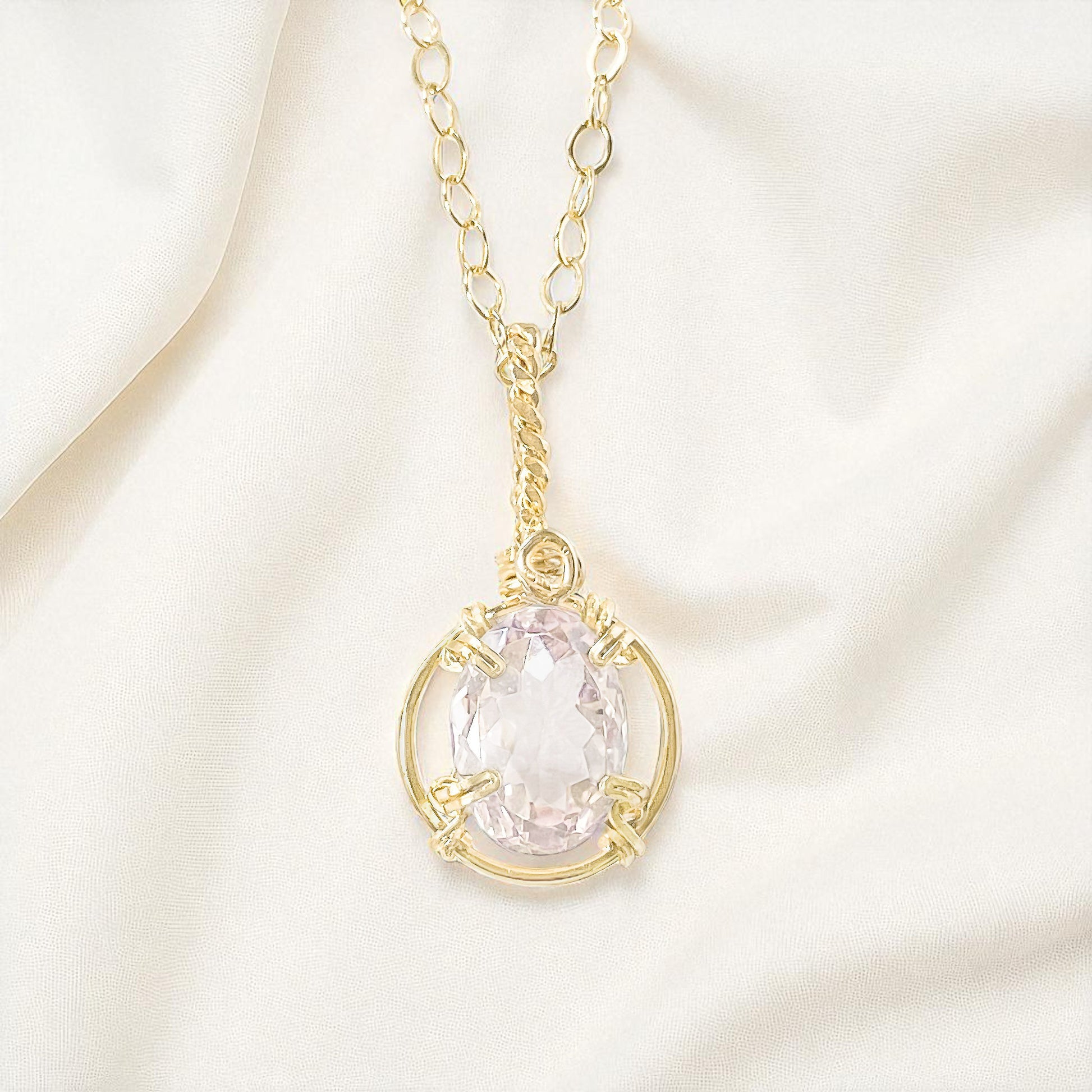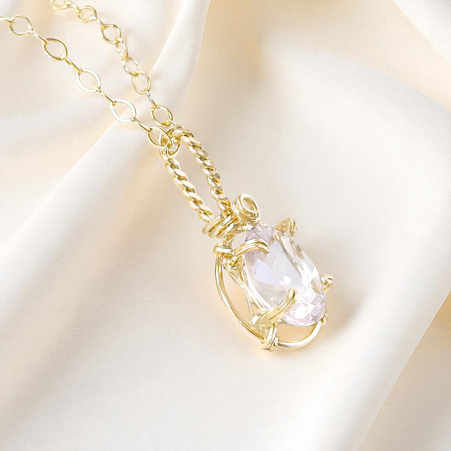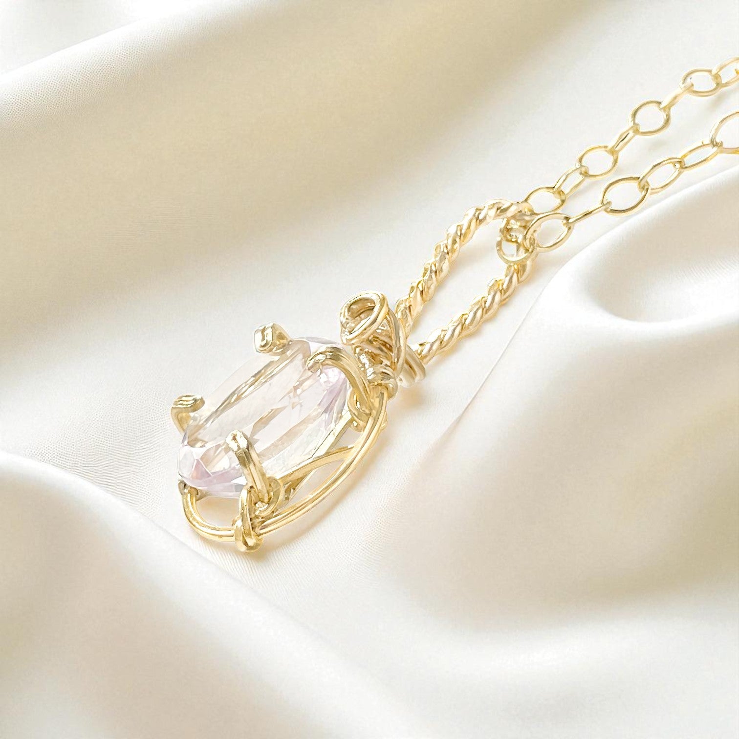 This pale pink gemstone is wire wrapped to a frame of gold. A beautiful twisted bail gives this unique pendant an added touch of elegance!