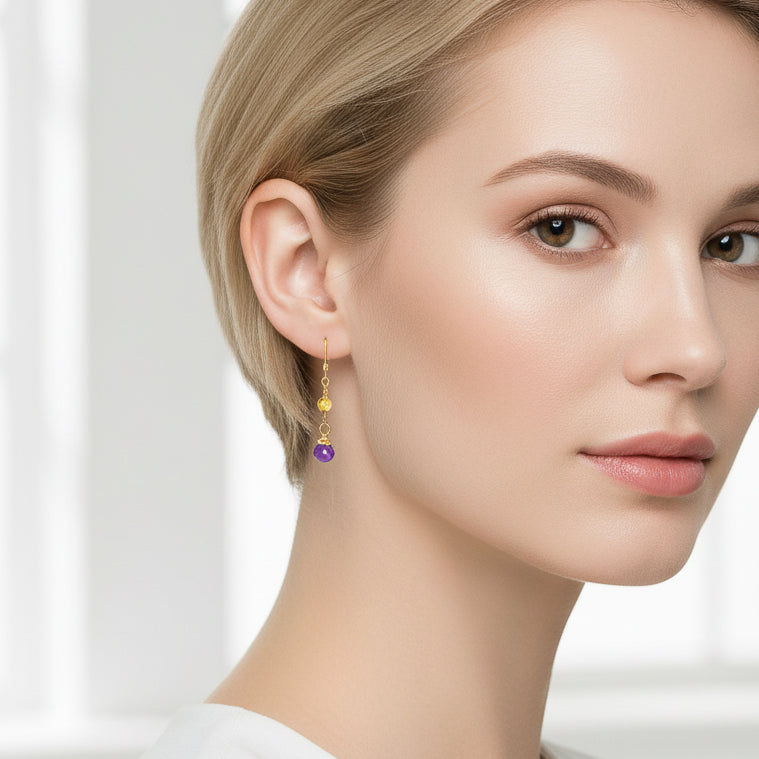 These earrings are so elegant and lovely! Pear-shaped purple amethyst briolette gemstones are wire-wrapped to round citrine gemstones for a completely unique look!