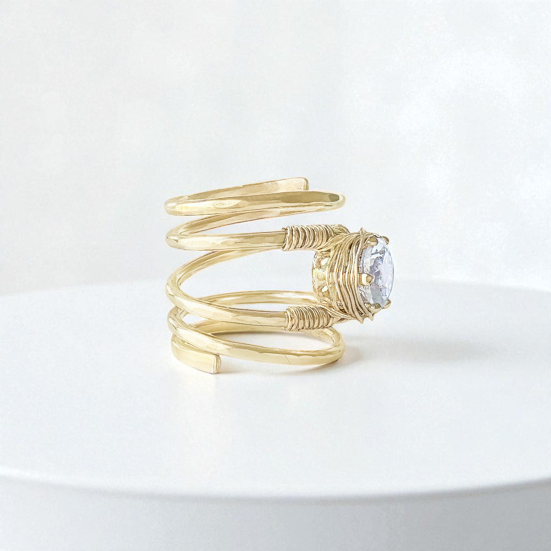 This ring was formed and hammered from one piece of gold wire. A white zircon gemstone is wire-wrapped to the base of the ring, and looks as if it is "floating" on the ring. This is definitely a showcase piece of jewelry which will get more than one look!